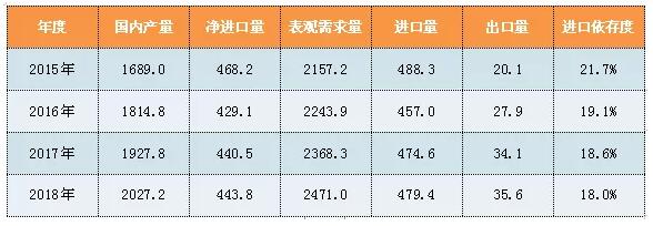 ????????2018年國內(nèi)聚丙烯粒料產(chǎn)量2027萬,進(jìn)口量479萬噸,出口量36萬噸,表觀消費(fèi)量2471萬噸,比2017年增加103萬噸,增長4.3%;進(jìn)口依存度18.0%,比2017年下降0.6個(gè)百分點(diǎn)。