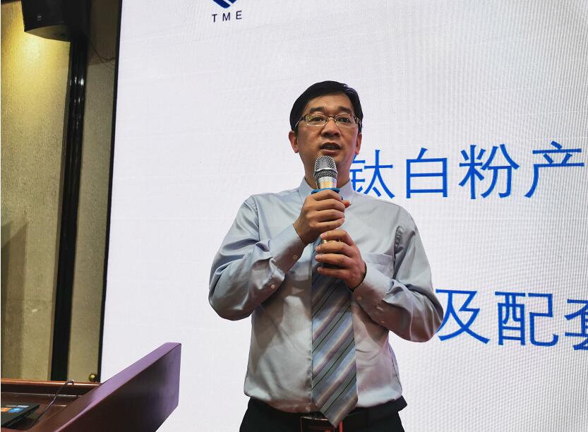 圖為壹化港(上海)網(wǎng)絡(luò)科技有限公司總經(jīng)理蔡緒波在會上作《鈦白粉產(chǎn)業(yè)融資需求及配套解決方案》的主旨報告。