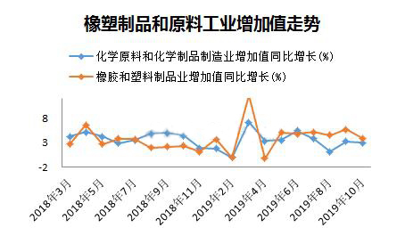 ????????10月份,化學原料和化學品制造業(yè)增加值同比增長3%,橡膠和塑料制品業(yè)增加值同比增長3.9%,顯然下游制品業(yè)增速還是快于上游原料,兩者增速差連續(xù)三個月收窄,源于10月份制品業(yè)下降速度快于原料。去年10月份PE、PP等塑料原料價格揭開下滑序幕,橡塑制品的增速明顯低于原料,總體看隨著原料端價格下跌,終端產(chǎn)品成本降低,從塑料制品增長角度看制品行業(yè)目前形勢略好于去年。
