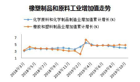 ????????1-10月份,化學原料和化學品制造業(yè)增加值同比增長4%,橡膠和塑料制品業(yè)增加值同比增長4.8%,年內(nèi)兩者呈現(xiàn)持續(xù)下降態(tài)勢。兩者增速差與上月持平,較前幾個月有所擴大,表明原料端價格下降支撐了終端產(chǎn)出增速。塑料制品業(yè)工業(yè)增加值無論同比還是累計同比,數(shù)據(jù)均略高于去年同期,表明塑料下游行業(yè)好于塑料原料。