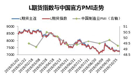 ????????PMI是經(jīng)濟(jì)先行指標(biāo)中一項非常重要的附屬指標(biāo),具有其高度的時效性。目前全球已有20多個國家建立了PMI體系,有關(guān)機(jī)構(gòu)已開始建立全球指數(shù)和歐元區(qū)指數(shù),PMI指數(shù)及其商業(yè)報告已成為世界經(jīng)濟(jì)運(yùn)行活動的重要評價指標(biāo)和世界經(jīng)濟(jì)變化的晴雨表。如圖所以,2019年3月份回升到50的臨界值之上,對應(yīng)的PE價格在第一季度的震蕩;3月份之后PMI一路下行,PE價格幾乎同步跟隨。