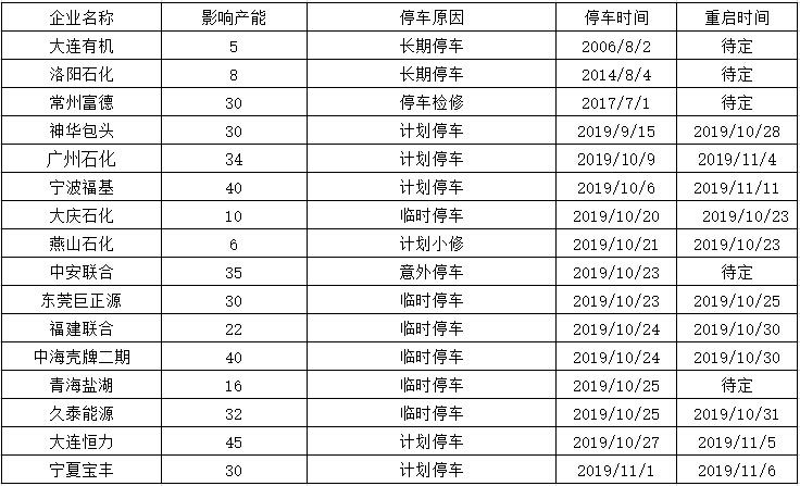????????10月份國內聚丙烯檢修裝置較上月明顯減少。本月檢修損失量21萬噸。月內裝置臨時停車較多,久泰能源、燕山石化、大慶石化、中安聯(lián)合、東莞巨正源、福建聯(lián)合二線、中海殼、久泰能源等裝置短期停車,多數(shù)已經(jīng)重啟。前期計劃檢修裝置延安煉廠、陜西延安能源、神華包頭、寧波臺塑等裝置月內已重啟。目前廣州石化一、三線、東華能源(寧波)裝置處于停車狀態(tài),預計11月初重啟。后期寧夏寶豐存檢修計劃,整體供應壓力較大。