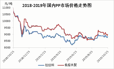 ????????2019年全年來看,國內聚丙烯市場表現(xiàn)不盡人意,雖然進入了傳統(tǒng)旺季,10月份國內聚丙烯市場價格小幅反彈后弱勢下行。國慶節(jié)后歸來庫存積累至高位,兩油小幅下調出廠價格,以降低庫存壓力;月中旬受國際原油走高、中美貿(mào)易局勢緩和等消息提振,PP期貨推漲下,市場價格反彈。后續(xù)隨著期貨連續(xù)走低,石化出廠價格轉跌,下游企業(yè)謹慎觀望,市場成交乏力,商家紛紛讓利促成交。臨近月底,隨著兩油庫存緩慢下降,石化出廠價止跌企穩(wěn)。月內拉絲主流價格在8700-9000元/噸。