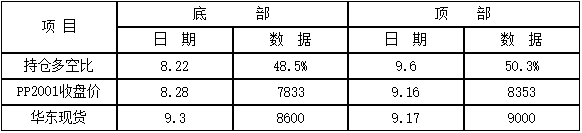 ????????第二、7月以來多空比曲線下行過程中,PP期現(xiàn)價格并不同步,多空比形成階段性底部和頂部相對領先,在50%臨界線之下,多單逐步增加,多空比逐步提升,此時配合基本面情況,有擇機介入短多的機會。多空比在8月22日達到階段性底部48.5%,之后開始一波反彈,多空比的底部領先期現(xiàn)價格一周左右時間,8月28日PP2001收盤7833元/噸,華東現(xiàn)貨在9月3日8600元/噸,相繼形成底部;9月6日,持倉多空比50.3%形成階段性頂部,且50%臨界線之上僅僅維持兩天就再次轉頭下行,此次多空比領先了期現(xiàn)價格10天左右??傊敹嗫毡?、期貨和現(xiàn)貨價格同向而行,“共振”之際,方可順勢而為。