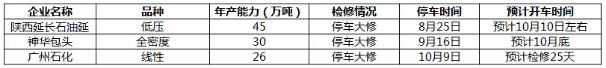 ????????9月份國內PE裝置檢修較上月稍有減少,PE共計損失量16.8萬噸。月內神華包頭全密度裝置、延能化低壓裝置大修,茂名石化老高壓停車檢修、上海石化低壓裝置故障停車目前仍未重啟。神華新疆高壓裝置、獨山子石化全套PE裝置、中安聯(lián)合線性裝置、中煤榆林全密度裝置開車,揚子巴斯夫、蘭州石化高壓裝置、四川石化低壓裝置月內短暫停車目前均已經重啟。整體來看,9月中下旬部分石化檢修裝置陸續(xù)重啟,國內PE供應較前期緩慢增加。