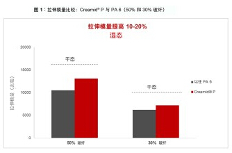 ????????Creamid? P 系列聚酰胺 6 (PA 6) 化合物在達到飽和狀態(tài)時的吸水量比典型PA6少近 1/3,因此濕態(tài)的拉伸特性提高 15-25%,并且展示出更高的流動性和更出色的表面特性,甚至在玻纖填充率較高的配方中也是如此。