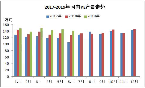 ????????據(jù)統(tǒng)計(jì),2019年上半年國內(nèi)PE產(chǎn)量在867.21萬噸,較2018年同期(802.68萬噸)增加64.53萬噸,增幅在8.04%。2019年上半年國內(nèi)PE石化大修裝置較少,開工率較高在92%-98%之間波動(dòng)。除此之外,內(nèi)蒙古久泰能源28萬噸/年全密度裝置在5月份順利投產(chǎn),6月份產(chǎn)量釋放產(chǎn)品逐步供應(yīng)市場。
