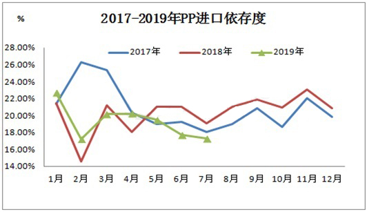 ????????由2017-2019年P(guān)P進(jìn)口依存度發(fā)現(xiàn),2019年4月份進(jìn)口依存度開(kāi)始逐步下挫,7月進(jìn)口依存度同比下降1.82%,環(huán)比下降0.42%。由此數(shù)據(jù)可發(fā)現(xiàn)進(jìn)口PP產(chǎn)品在國(guó)內(nèi)依存度呈現(xiàn)逐步下降趨勢(shì)。其實(shí)這與國(guó)內(nèi)PP產(chǎn)能激增密不可分,進(jìn)口PP產(chǎn)品由于整體價(jià)高,在國(guó)內(nèi)市場(chǎng)競(jìng)爭(zhēng)優(yōu)勢(shì)逐步減弱,除部分高端專用產(chǎn)品在下游仍占據(jù)優(yōu)勢(shì)外,按照目前國(guó)內(nèi)PP擴(kuò)能計(jì)劃逐步實(shí)現(xiàn),進(jìn)口PP在國(guó)內(nèi)依存度有進(jìn)一步下降趨勢(shì)。