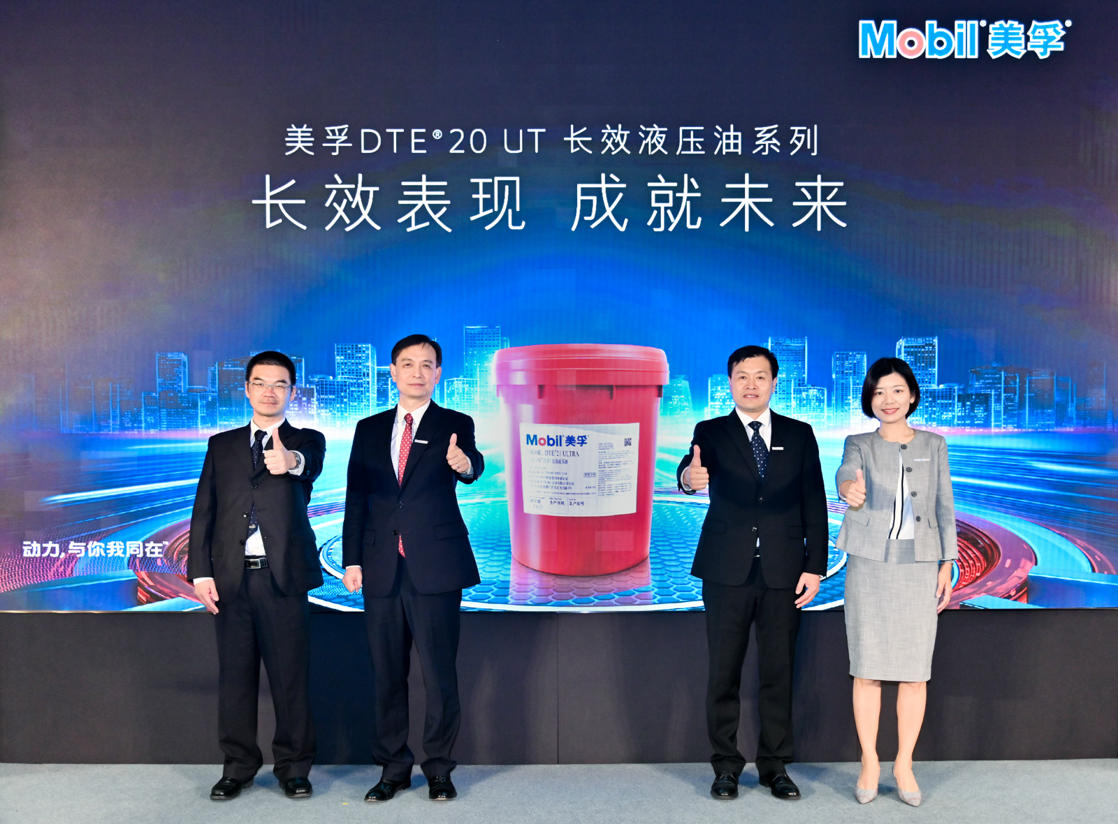 (從左至右)埃克森美孚(中國)投資有限公司北亞區(qū)設(shè)備制造商經(jīng)理趙峰先生、企業(yè)用戶業(yè)務(wù)總經(jīng)理楊東先生、北亞潤滑油業(yè)務(wù)總工程師陳思軒先生和北亞潤滑油企業(yè)用戶市場部總經(jīng)理鄭逸清女士在美孚DTE? 20 UT長效液壓油系列產(chǎn)品發(fā)布會上合影