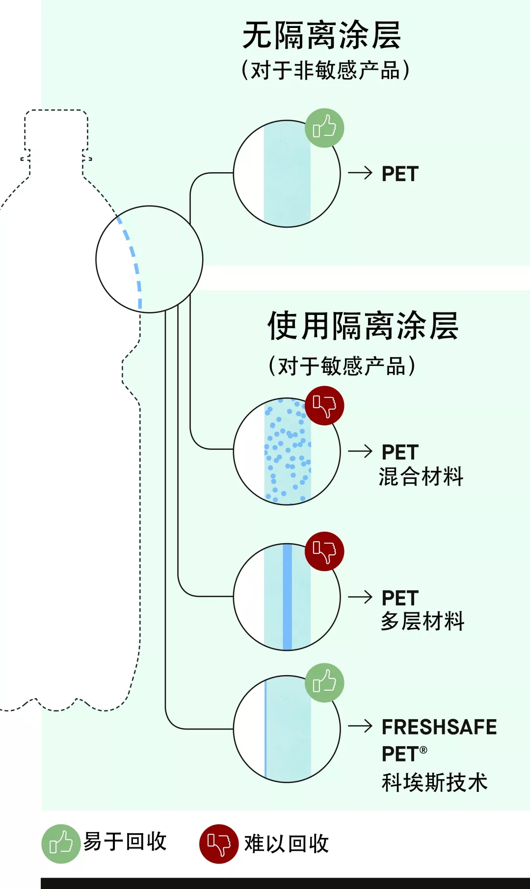 ????????在這種系統(tǒng)中,PET瓶經(jīng)過吹瓶, 其 瓶的內(nèi)壁會(huì)立即涂覆一層輕薄的玻璃涂層。這個(gè)玻璃層能形成一層屏障,阻止飲料風(fēng)味和二氧化碳逃逸,同時(shí)保證氧氣不會(huì)滲入瓶?jī)?nèi),從而防止維生素流失。對(duì)使用FreshSafe PET? 涂層技術(shù)的PET瓶,飲料的味道和新鮮度能維持更長(zhǎng)時(shí)間。在回收過程中,玻璃涂層會(huì)被標(biāo)準(zhǔn)過程中的苛性堿沖洗掉。