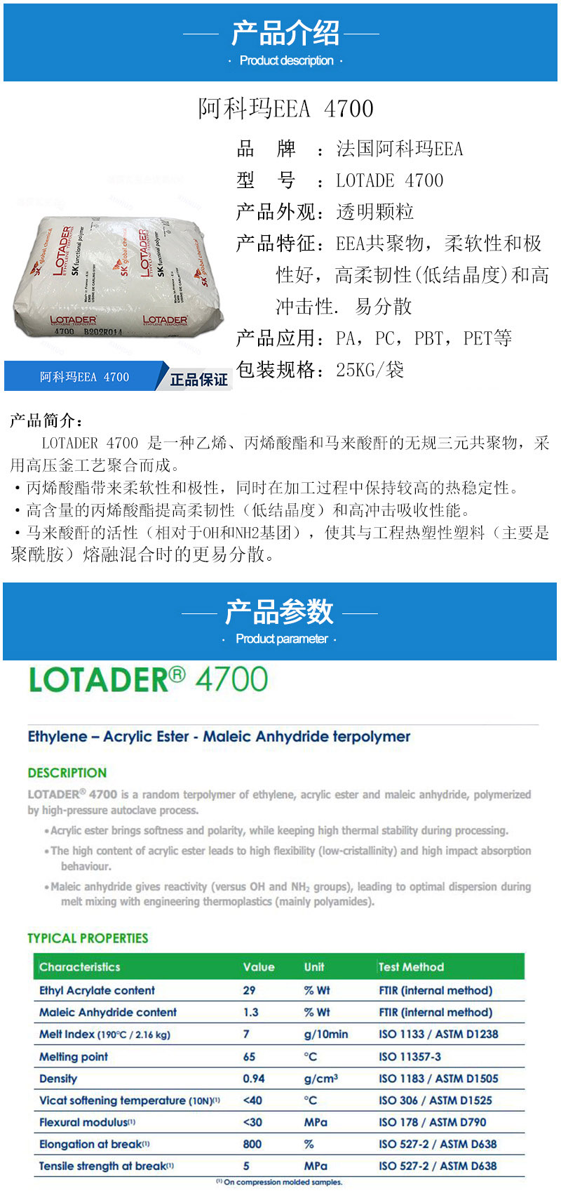 - Lotader EEA 法國阿科瑪 4700 MAH 三元共聚物 高抗沖 熱穩(wěn)定性 物性表, Lotader EEA 法國阿科瑪 4700 MAH 三元共聚物 高抗沖 熱穩(wěn)定性 產(chǎn)品參數(shù),Lotader EEA 法國阿科瑪 4700 MAH 三元共聚物 高抗沖 熱穩(wěn)定性 性能表,Lotader EEA 法國阿科瑪 4700 MAH 三元共聚物 高抗沖 熱穩(wěn)定性 出廠報(bào)告, MSDS,, 物質(zhì)安全資料表, UL黃卡,{ SGS報(bào)告, RoHS, 食品級(jí)認(rèn)證, NSF飲用水標(biāo)準(zhǔn), 產(chǎn)品資料, 產(chǎn)品性能, 出廠報(bào)告, 原廠原包, 代理商, 熱變形溫度, 熔指數(shù), 流動(dòng)系數(shù), 抗沖擊性能、沖擊強(qiáng)度, 低溫韌性、低溫抗沖擊性能, 熔體流動(dòng)系數(shù)、熔體流動(dòng)速率, 加工工藝、加工參數(shù)、加工溫度, 歐盟RoHS 德國FDA 美國FDA 日本FDA