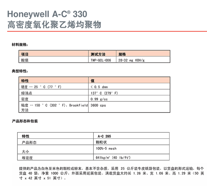 - Honeywell霍尼韋爾 A-C 330 蠟粉 高密度氧化聚乙烯蠟 物性表, Honeywell霍尼韋爾 A-C 330 蠟粉 高密度氧化聚乙烯蠟 產(chǎn)品參數(shù),Honeywell霍尼韋爾 A-C 330 蠟粉 高密度氧化聚乙烯蠟 性能表,Honeywell霍尼韋爾 A-C 330 蠟粉 高密度氧化聚乙烯蠟 出廠報告, MSDS,, 物質(zhì)安全資料表, UL黃卡,{ SGS報告, RoHS, 食品級認證, NSF飲用水標準, 產(chǎn)品資料, 產(chǎn)品性能, 出廠報告, 原廠原包, 代理商, 熱變形溫度, 熔指數(shù), 流動系數(shù), 抗沖擊性能、沖擊強度, 低溫韌性、低溫抗沖擊性能, 熔體流動系數(shù)、熔體流動速率, 加工工藝、加工參數(shù)、加工溫度, 歐盟RoHS 德國FDA 美國FDA 日本FDA