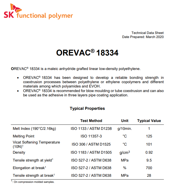 - LLDPE馬來酸酐改性 Orevac 18334 法國阿科瑪 EVOH極性樹脂粘接 物性表, LLDPE馬來酸酐改性 Orevac 18334 法國阿科瑪 EVOH極性樹脂粘接 產(chǎn)品參數(shù), LLDPE馬來酸酐改性 Orevac 18334 法國阿科瑪 EVOH極性樹脂粘接 性能表, LLDPE馬來酸酐改性 Orevac 18334 法國阿科瑪 EVOH極性樹脂粘接 出廠報告, MSDS,, 物質(zhì)安全資料表, UL黃卡,{ SGS報告, RoHS, 食品級認(rèn)證, NSF飲用水標(biāo)準(zhǔn), 產(chǎn)品資料, 產(chǎn)品性能, 出廠報告, 原廠原包, 代理商, 熱變形溫度, 熔指數(shù), 流動系數(shù), 抗沖擊性能、沖擊強(qiáng)度, 低溫韌性、低溫抗沖擊性能, 熔體流動系數(shù)、熔體流動速率, 加工工藝、加工參數(shù)、加工溫度, 歐盟RoHS 德國FDA 美國FDA 日本FDA