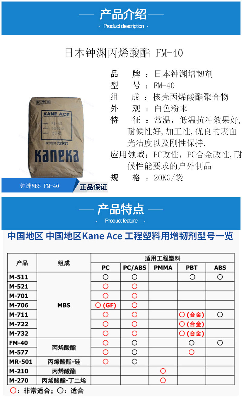 Kane Ace FM-40是一種全丙烯酸酯類(lèi)核殼型抗沖擊改性劑。