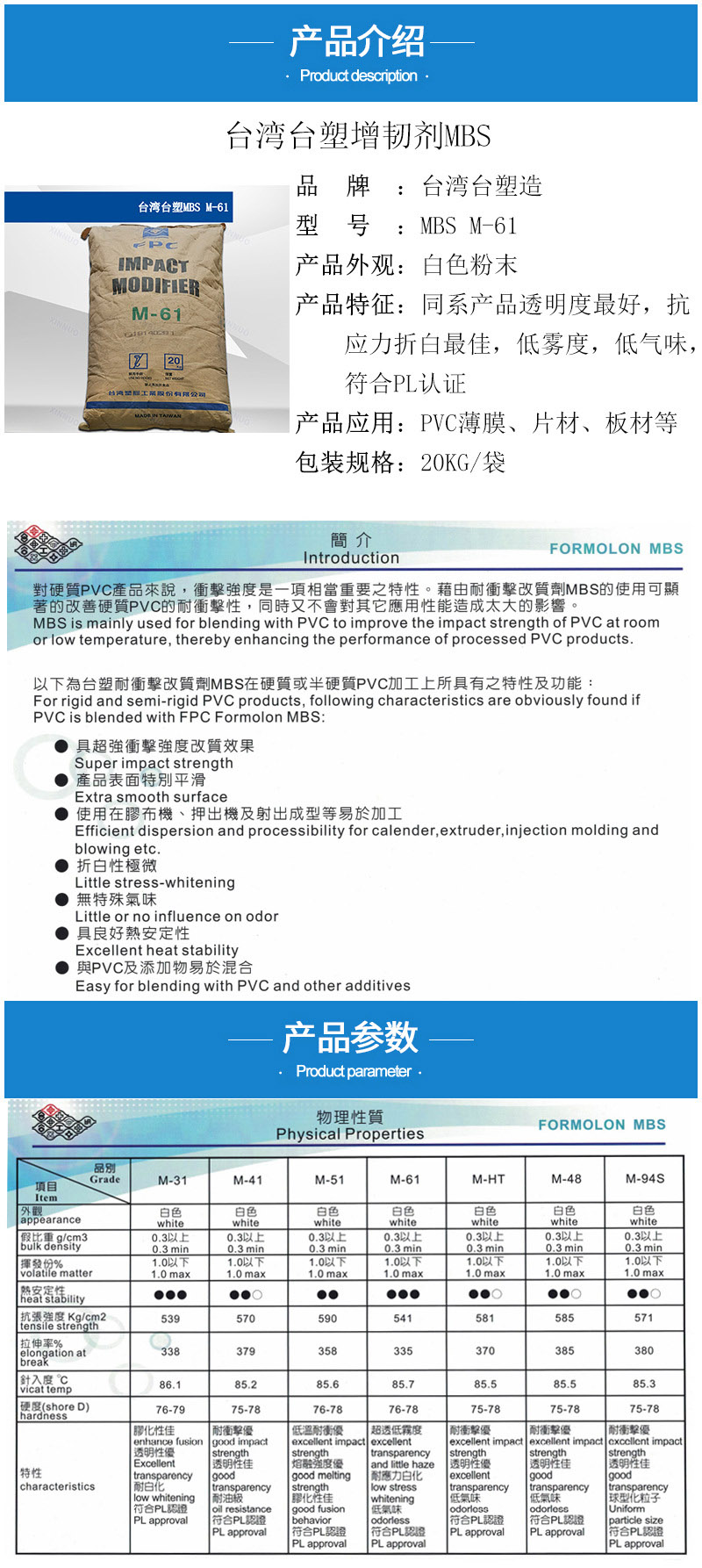- 臺(tái)塑MBS M61高透明性 MBS61 抗折白 PVC簿膜片材板材增韌劑M-61 物性表, 臺(tái)塑MBS M61高透明性 MBS61 抗折白 PVC簿膜片材板材增韌劑M-61 產(chǎn)品參數(shù),臺(tái)塑MBS M61高透明性 MBS61 抗折白 PVC簿膜片材板材增韌劑M-61 性能表,臺(tái)塑MBS M61高透明性 MBS61 抗折白 PVC簿膜片材板材增韌劑M-61 出廠報(bào)告, MSDS,, 物質(zhì)安全資料表, UL黃卡,{ SGS報(bào)告, RoHS, 食品級(jí)認(rèn)證, NSF飲用水標(biāo)準(zhǔn), 產(chǎn)品資料, 產(chǎn)品性能, 出廠報(bào)告, 原廠原包, 代理商, 熱變形溫度, 熔指數(shù), 流動(dòng)系數(shù), 抗沖擊性能、沖擊強(qiáng)度, 低溫韌性、低溫抗沖擊性能, 熔體流動(dòng)系數(shù)、熔體流動(dòng)速率, 加工工藝、加工參數(shù)、加工溫度, 歐盟RoHS 德國FDA 美國FDA 日本FDA