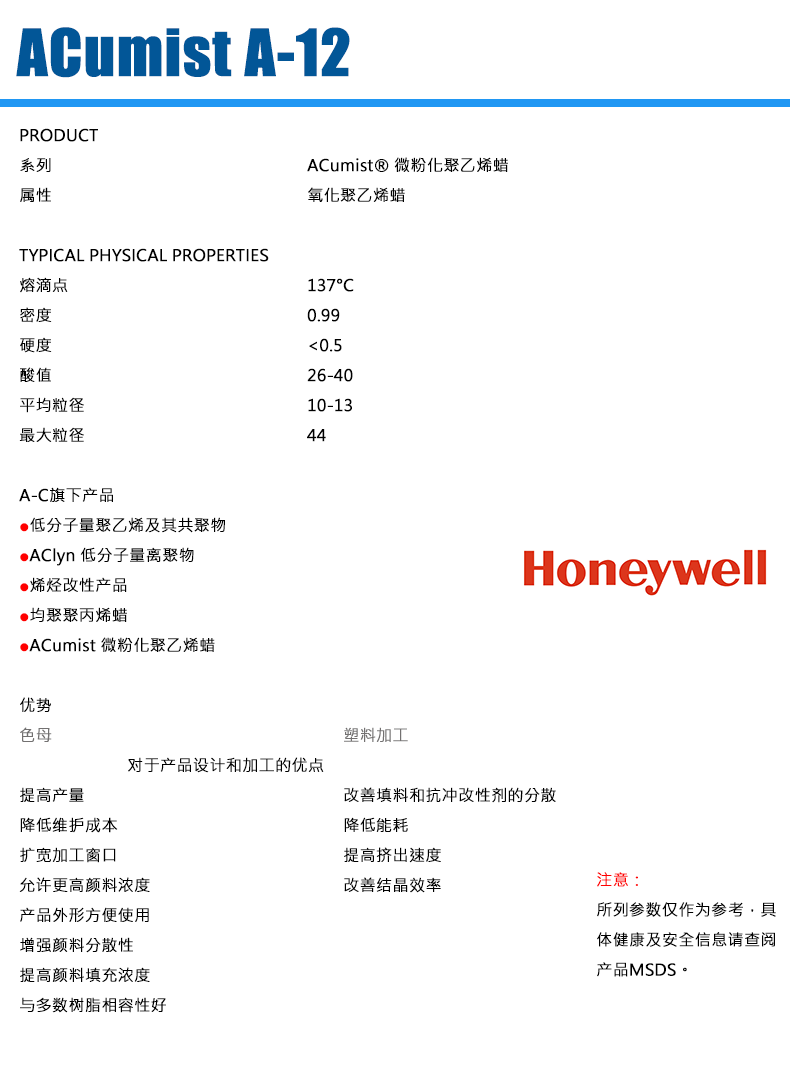 - 霍尼韋爾蠟粉 ACumist A-12 原裝進(jìn)口A12 物性表, 霍尼韋爾蠟粉 ACumist A-12 原裝進(jìn)口A12 產(chǎn)品參數(shù),霍尼韋爾蠟粉 ACumist A-12 原裝進(jìn)口A12 性能表,霍尼韋爾蠟粉 ACumist A-12 原裝進(jìn)口A12 出廠報告, MSDS,, 物質(zhì)安全資料表, UL黃卡,{ SGS報告, RoHS, 食品級認(rèn)證, NSF飲用水標(biāo)準(zhǔn), 產(chǎn)品資料, 產(chǎn)品性能, 出廠報告, 原廠原包, 代理商, 熱變形溫度, 熔指數(shù), 流動系數(shù), 抗沖擊性能、沖擊強(qiáng)度, 低溫韌性、低溫抗沖擊性能, 熔體流動系數(shù)、熔體流動速率, 加工工藝、加工參數(shù)、加工溫度, 歐盟RoHS 德國FDA 美國FDA 日本FDA