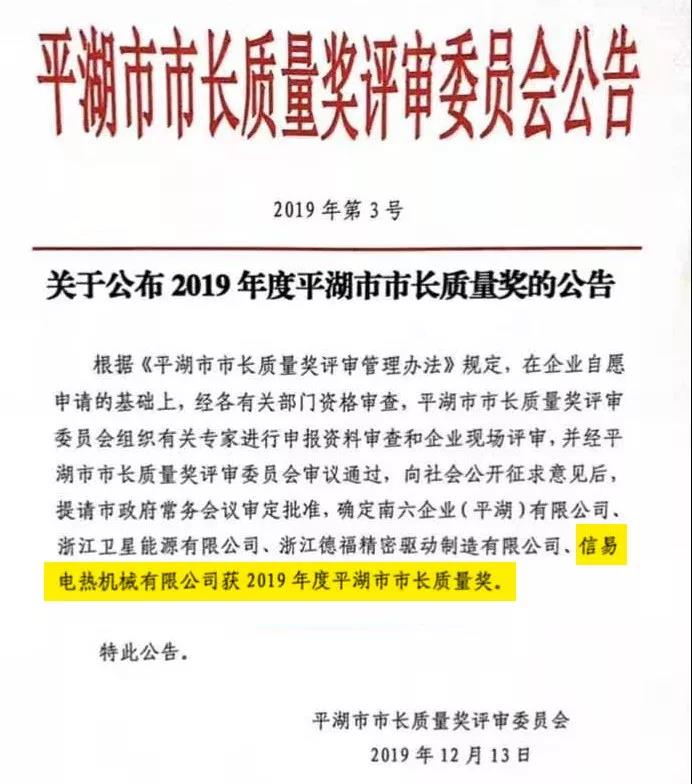 平湖市市長質(zhì)量獎是平湖市人民政府設(shè)立的最高質(zhì)量獎項,由平湖市政府表彰和獎勵,每年度評審一次,每屆不超過5個。該獎項旨在發(fā)揮市長質(zhì)量獎的導(dǎo)向作用,推動企業(yè)實施卓越績效模式和先進質(zhì)量管理方法,深入開展質(zhì)量管理創(chuàng)新、質(zhì)量強企創(chuàng)建活動,樹立質(zhì)量標桿,加強典型示范,加快推進質(zhì)量強市建設(shè),促進經(jīng)濟轉(zhuǎn)型升級。平湖信易2019年度獲此殊榮,深感榮幸,同時亦感到責(zé)任之深重,今后信易將繼續(xù)在精益管理,保證質(zhì)量,做好品牌等方面努力進取,追求卓越,為塑膠輔機行業(yè)做出更大的貢獻。