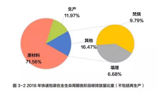 從圖 3-2 和圖 3-3 中可知,在 2018 年我國快遞包裝材料在生命周期各階段中(不包括再生),原材料階段(71.56%)的碳排放所占比重大,處置階段占比重較小(焚燒 9.79%,填埋6.68%),生產(chǎn)階段(11.97%)占比小。