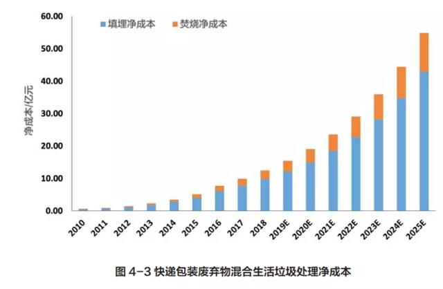 平均焚燒 1 噸快遞垃圾所需費用 511 元,根據(jù)住建部發(fā)布的《中國城市建設統(tǒng)計年鑒》,2016 年我國生活垃圾填埋比例高達 60%,而焚燒比例為 38%,依此比例推算,2018 年快遞包裝焚燒量為 81.27 萬噸,處理費用也增至 4.15 億元。雖然生活垃圾焚燒發(fā)電產(chǎn)生了部分經(jīng)濟效益,但效益遠低于成本。2018 年垃圾焚燒效益雖達到 1.46 億元,但凈成本也增長到了 2.69 億。