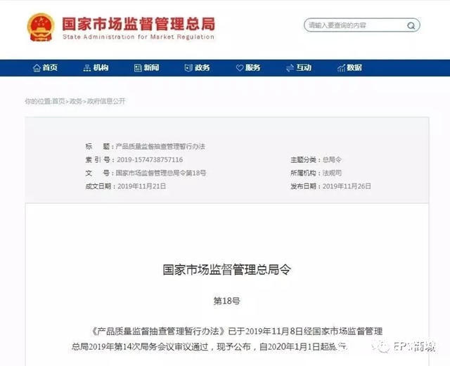 11月26日,國家市場監(jiān)督管理總局發(fā)布《產(chǎn)品質(zhì)量監(jiān)督抽查管理暫行辦法》,將自2020年1月1日起施行?!掇k法》共56條,明確了監(jiān)督抽查的組織、抽樣、檢驗(yàn)、異議處理、結(jié)果處理及相關(guān)人員應(yīng)承擔(dān)的法律責(zé)任,對于加強(qiáng)產(chǎn)品質(zhì)量監(jiān)督管理、規(guī)范產(chǎn)品質(zhì)量監(jiān)督抽查工作、保護(hù)消費(fèi)者的合法權(quán)益有重要意義。