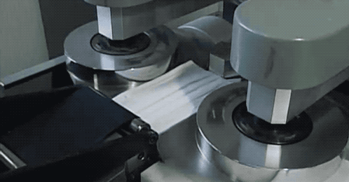 左右兩大卷無紡布,等著要補(bǔ)強(qiáng)口罩邊沿了。 一側(cè)被包裹之后,立刻壓平粘合。 這時(shí)候出來的原先已經(jīng)裁斷好的口罩們,再次被連到了一起,這真的是自古多情空余恨,此恨綿綿無絕期... 所以還需要一個(gè)裁斷補(bǔ)強(qiáng)邊的環(huán)節(jié),一刀兩斷...