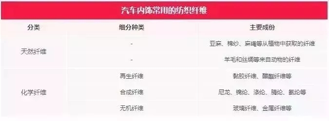 ????????紡織纖維在汽車內飾中主要用于汽車座椅、車廂內壁、頂棚表皮、安全帶、隔音墊、地墊等,除了具備一定的產(chǎn)品功能性之外,相對于其他材料,紡織纖維在汽車隔音、隔熱、降噪方面有一定的優(yōu)勢。