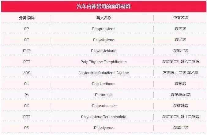 ????????根據(jù)樹脂的分子結構和熱性能的不同,塑料分為熱塑性塑料和熱固性塑料。汽車內飾常用的塑料大多是熱塑性塑料,主要包括PP、PE、PVC、PET、ABS等。