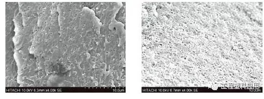 ????????右上圖為添加6% MBS和2% SAN-g-MAH改性回收料的斷面顯微形貌,斷面十分均勻,出現(xiàn)了小而密的孔洞,形成了較為均一的互穿互鎖網(wǎng)狀“海綿”相疇體系。進(jìn)一步提升了MBS增韌效果,回收料力學(xué)性能得到明顯提升。