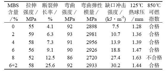 ????????當(dāng)MBS添加量達(dá)8%時(shí),可燃性指數(shù)出現(xiàn)不合格。在MBS極限添加量6%基礎(chǔ)上,添加2%增容劑SAN-g-MAH(下表中6+2所示)可進(jìn)一步提升回收料的綜合力學(xué)性能,且可保證可燃性指數(shù)合格。