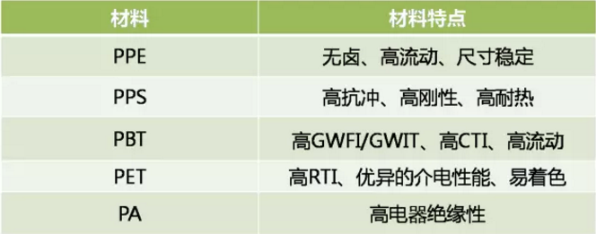 ????????電器連接件如繼電器、高壓接插件等都需要添加阻燃材料,這是基本要求。接插件金屬端子需要插拔次數(shù)多,還要求壽命要長,以免老化斷裂耐熱。目前常見的材料主要有PBT、PA等材料。