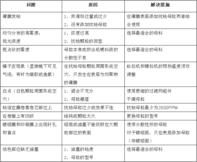 ????????薄膜生產(chǎn)廠家使用抗粘連母料所出現(xiàn)的問題分析和解決方法: