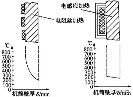 圖1 電阻加熱器和感應(yīng)加熱器加熱機筒時的溫度梯度