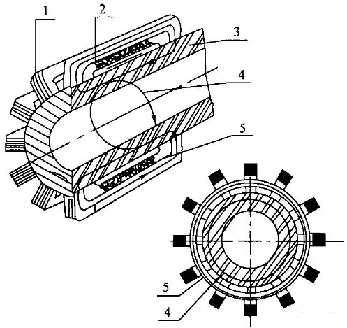 ????????這種加熱器是在機筒的外壁上隔一定的間距裝上若干組外面包以主線圈5的硅鋼片1。當(dāng)將交流電源通入主線圈時,就產(chǎn)生了如圖中所示方向的磁力線,并且在硅鋼片和機筒之間形成了一個封閉的磁環(huán)。當(dāng)磁通發(fā)生變化時,就會在封閉回路中產(chǎn)生感應(yīng)電動勢,從而引起二次感應(yīng)電壓及感應(yīng)電流,即圖中所示的環(huán)形電流,亦叫電的渦流。渦流在機筒中遇到阻力就產(chǎn)生熱量。