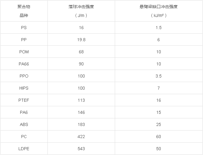 ????????衡量塑料沖擊強度大小的指標有三個,分別為懸臂梁沖擊強度、簡支梁沖擊強度和落球沖擊強度,它們相互之間沒有相互可轉換性,也沒有相互可對比性,甚至有時還會出現相反的結果,例如PA66和PPO、PC和LDPE等等,具體見表1所示。因此要對不同塑料沖擊強度大小進行比較,必須用同一種測試方法,才具有可比性。