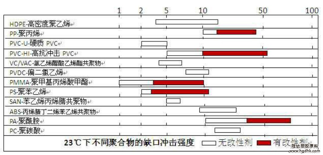 從上圖可見 PA 的抗沖擊性能最好;其次是 PC。PP、PVC-HI、PMMA、PS、PA 添加沖擊改性劑后,抗沖擊性能大大提高。ABS、PA、PC 即使不加抗充擊改性劑 的抗沖擊性能也較大。其中 PMMA 和 PC 都是透明材料,PMMA 的剛性好,脆;PC 的韌性好,不脆。無改性劑的 PS 抗沖擊性能較差,我們?cè)?jīng)為客戶測(cè)試過加入改 性劑的 PS 產(chǎn)品,抗沖擊性能提高許多。 沖擊改性劑的品種很多,常用的有 ACR-丙烯酸酯類樹脂、MBS-甲基丙烯酸甲酯-丁二烯-苯乙烯共聚物、CPE-氯化聚乙烯、ABS、EVA、EPT-三元乙丙膠等。 從制品的改性效果來看,ACR 是綜合性能最好的一類,MBS 是透明制品重要的沖擊改性劑,在全球沖擊改性劑市場(chǎng)中占有重要地位。