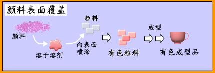 把溶有顏料的涂料噴涂在粒料表面進(jìn)行覆蓋,可以輕而易舉進(jìn)行著色,廣泛滿(mǎn)足用戶(hù)的需求。但是與混合法相比,顏料的分散性差一些。