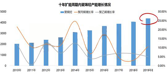 ????????隨著新型城鎮(zhèn)化、新型工業(yè)化、農(nóng)業(yè)現(xiàn)代化和國際貿(mào)易發(fā)展等對聚烯烴需求的總體支撐,以及國民高質(zhì)量生活、教育、醫(yī)療、養(yǎng)老等服務(wù)性需求提升,聚烯烴在新材料、汽車輕量化、綠色建材、醫(yī)療器械、食品級包裝、電子電器小型化等方面的應(yīng)用日益廣泛。生育政策放開、人口老齡化、醫(yī)療需求增加等都刺激高品質(zhì)聚烯烴樹脂需求增長,因此近幾年國內(nèi)聚烯烴產(chǎn)能經(jīng)歷了快速到高速的增長。PE非耐消費(fèi)品占比在73%,PP在66%,一次性快消品的需求特征決定其需求相對穩(wěn)定。