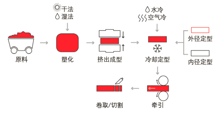借助螺桿或柱塞的擠壓作用,使受熱熔融的高分子材料在壓力的推動(dòng)下,強(qiáng)行通過機(jī)頭模具而成型為具有恒定截面連續(xù)型材。目前我國(guó)擠出成型制品占塑料制品總量的1/3以上。