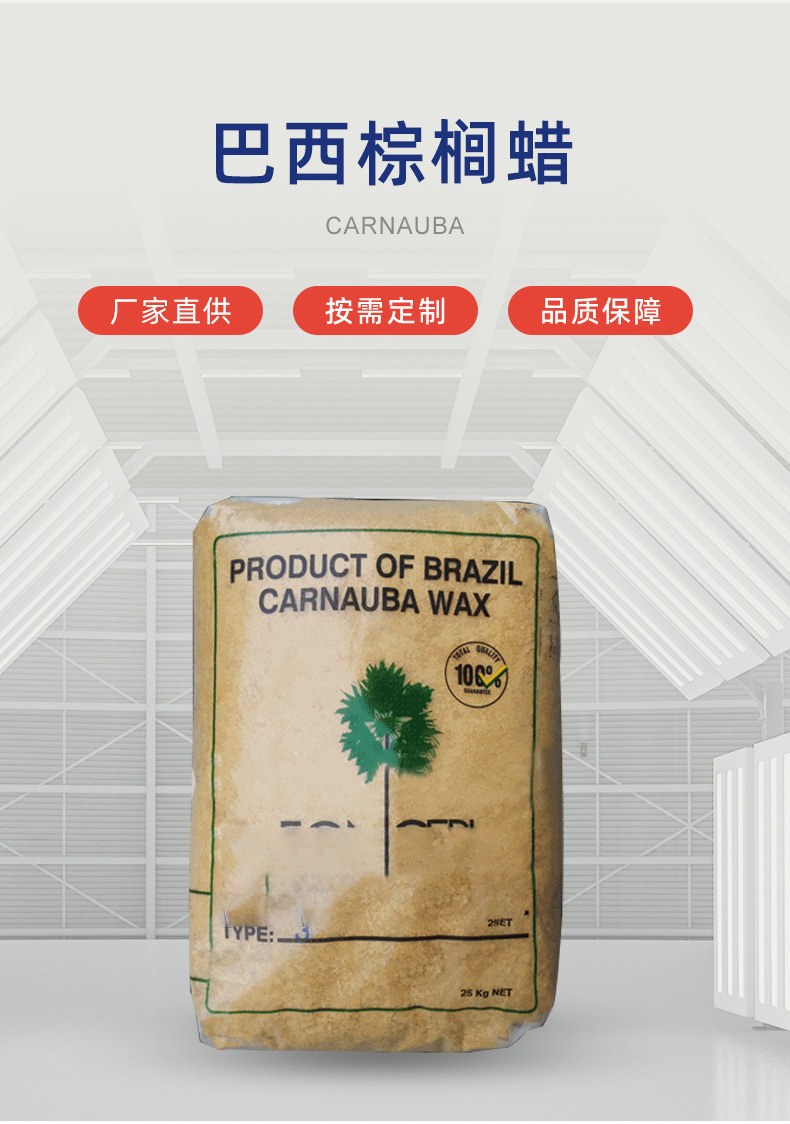 巴西棕櫚蠟質(zhì)地非常堅(jiān)硬,具有極高的光澤,極易乳化,有著良好的保油性,它最大的優(yōu)點(diǎn)是具有其它蠟所沒(méi)有的光澤度和硬度。此外,它具有的拋光特性使其成為皮革等行業(yè)上不可或缺的原料。可應(yīng)用于制造復(fù)寫(xiě)紙。棕櫚蠟稀薄而黏滯度小,樹(shù)脂含量低,涂布均勻,流動(dòng)性能好,制成的復(fù)寫(xiě)紙性能好。也巴西棕櫚蠟可用于地板蠟和鞋油,具有光澤好、光潔度高、表面沒(méi)有油膩的優(yōu)點(diǎn)。還可用于橡膠防老劑,同時(shí)具有一定的軟化與潤(rùn)滑作用,使膠料易脫模和壓出,使成品外觀平整。